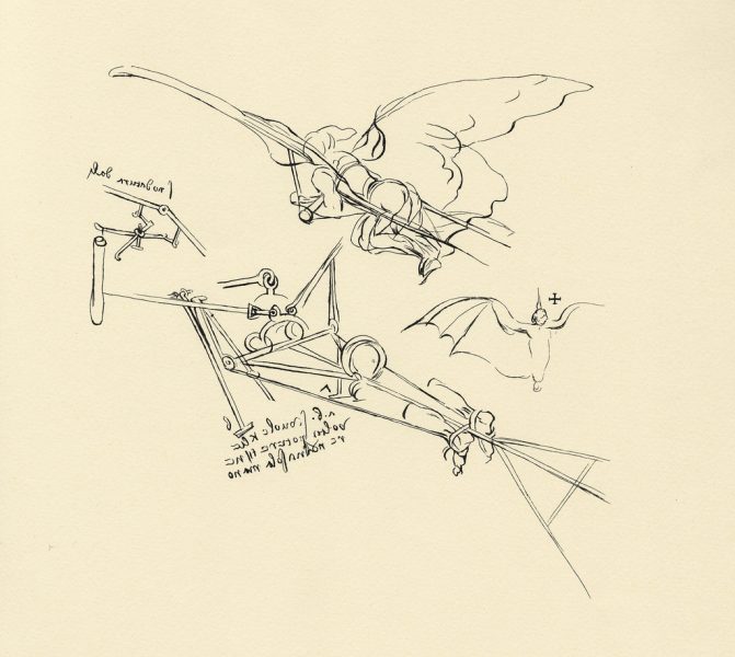 Naast studie naar menselijke anatomie, was Leonardo ook geïnteresseerd in de anatomie van dieren. Vooral vogels trokken zijn aandacht. Leonardo was vanaf zijn jonge jaren gefascineerd door vliegen. Dit onderzoek vertaalde hij naar de praktijk in zijn conceptontwerpen voor een vliegmachine op basis van vleermuis vleugels en een ontwerp voor een helikopter-achtig voertuig. De legende dat hij een van zijn leerlingen in de vliegmachine heeft geduwd en deze vervolgens neerstortte is naar alle waarschijnlijkheid een fabel. Het is zelfs onduidelijk of Leonardo een van beide apparaten ooit gebouwd heeft. Zijn tekeningen en begeleidende teksten zijn vaak vaag en niet eenduidig. Leonardo praat over de principes en methoden die het volgens hem mogelijk maken om met een dergelijk voertuig te vliegen, maar de uitgewerkte details ontbreken.